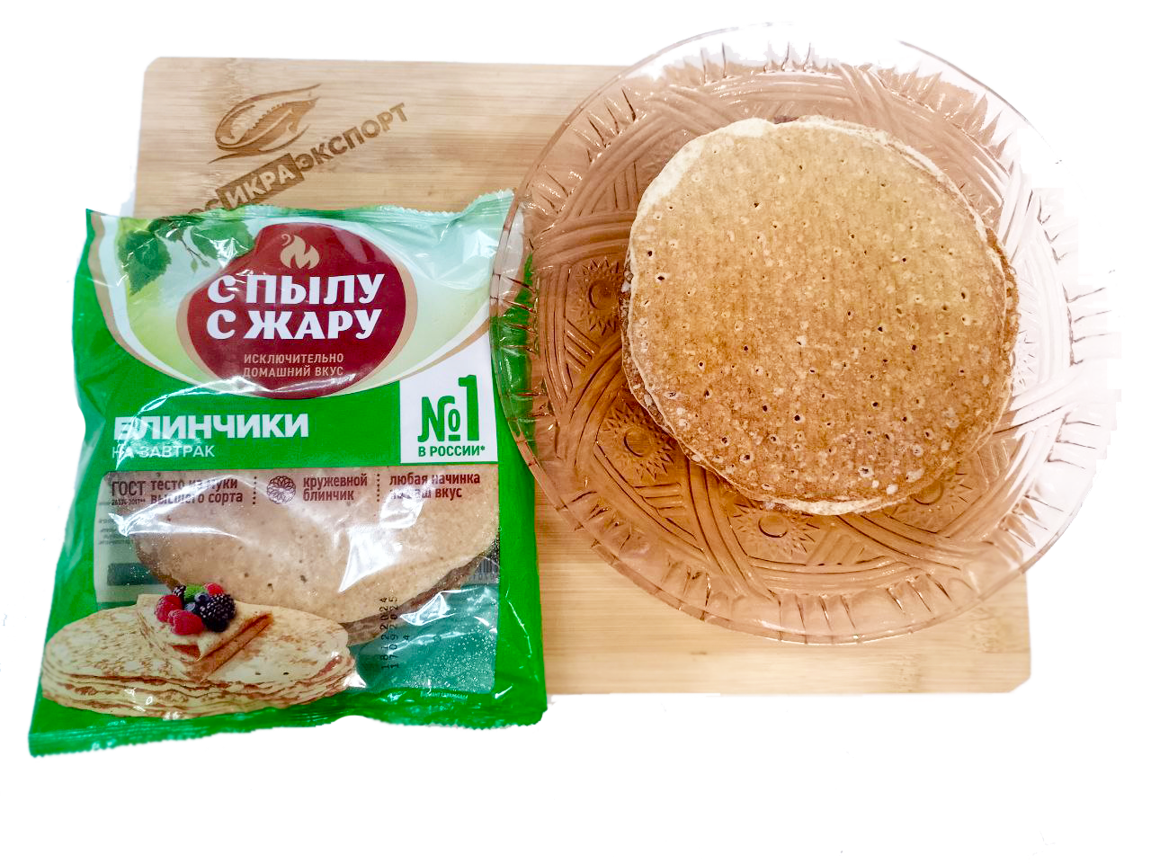 не размораживая блинчики, снять защитную пленку, не вынимая из лоточка, разогреть в течение 3-5 минут в микроволновой печи