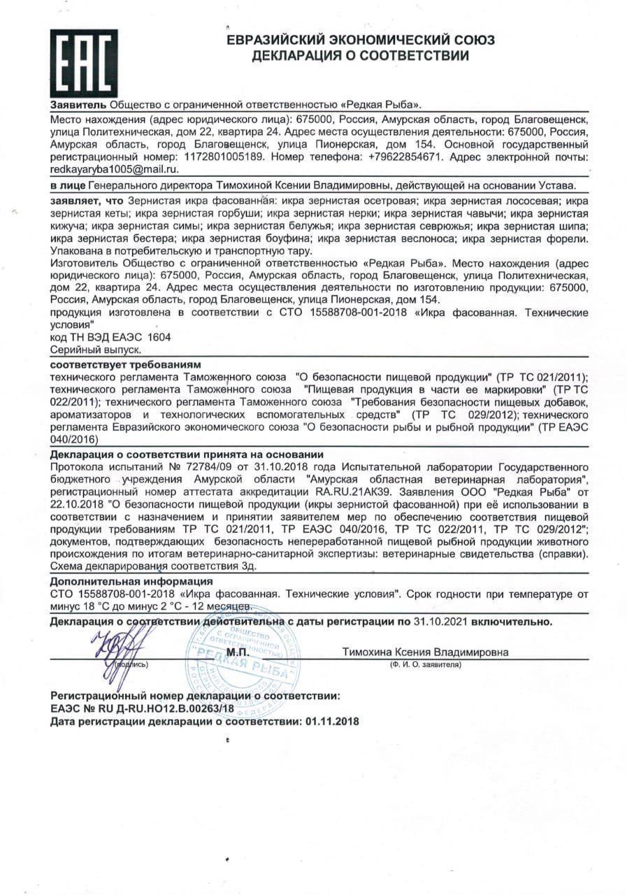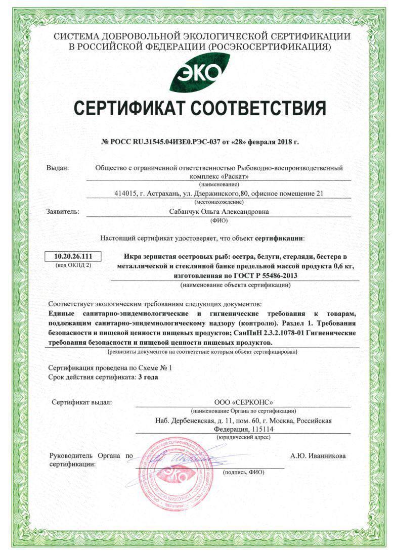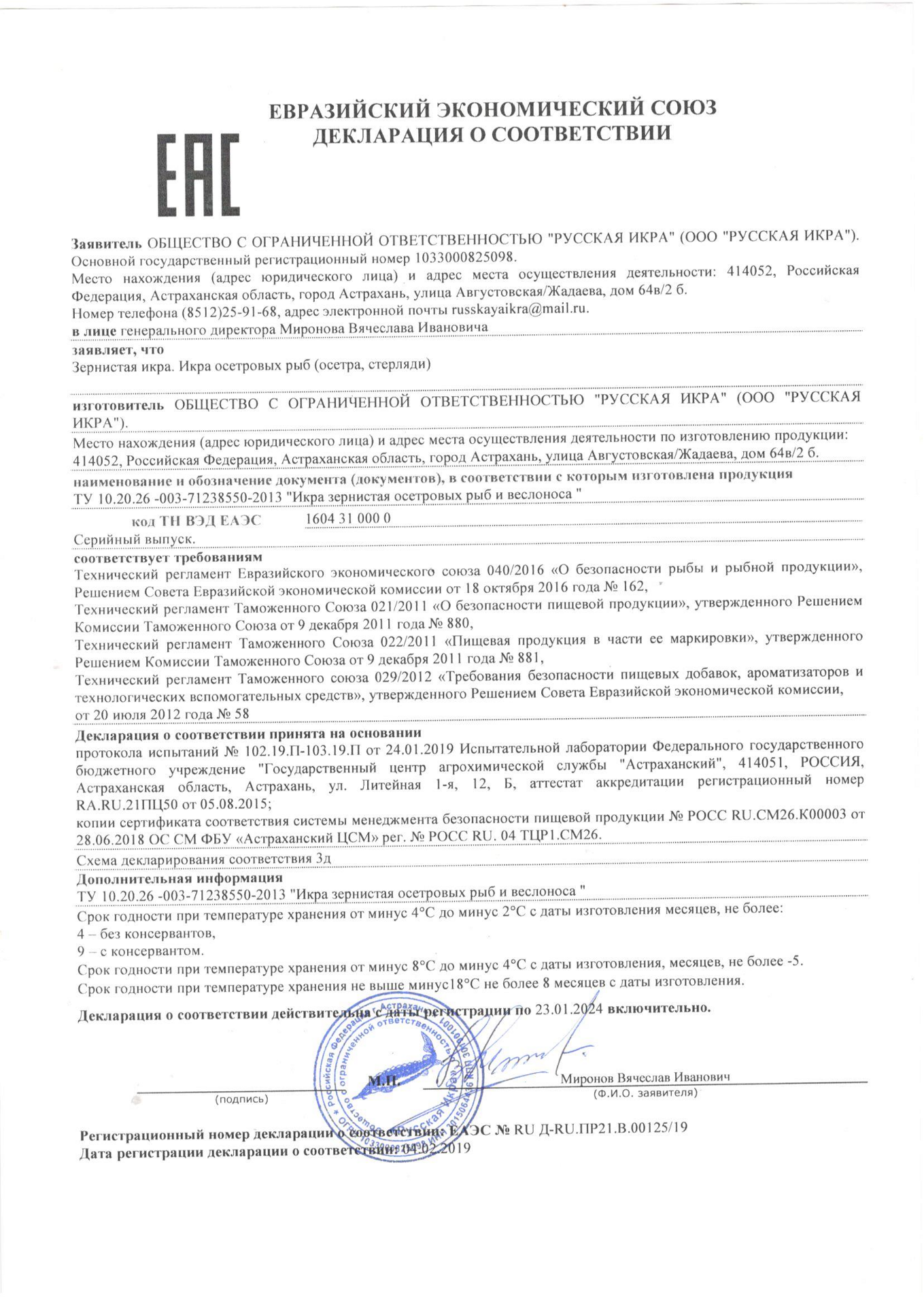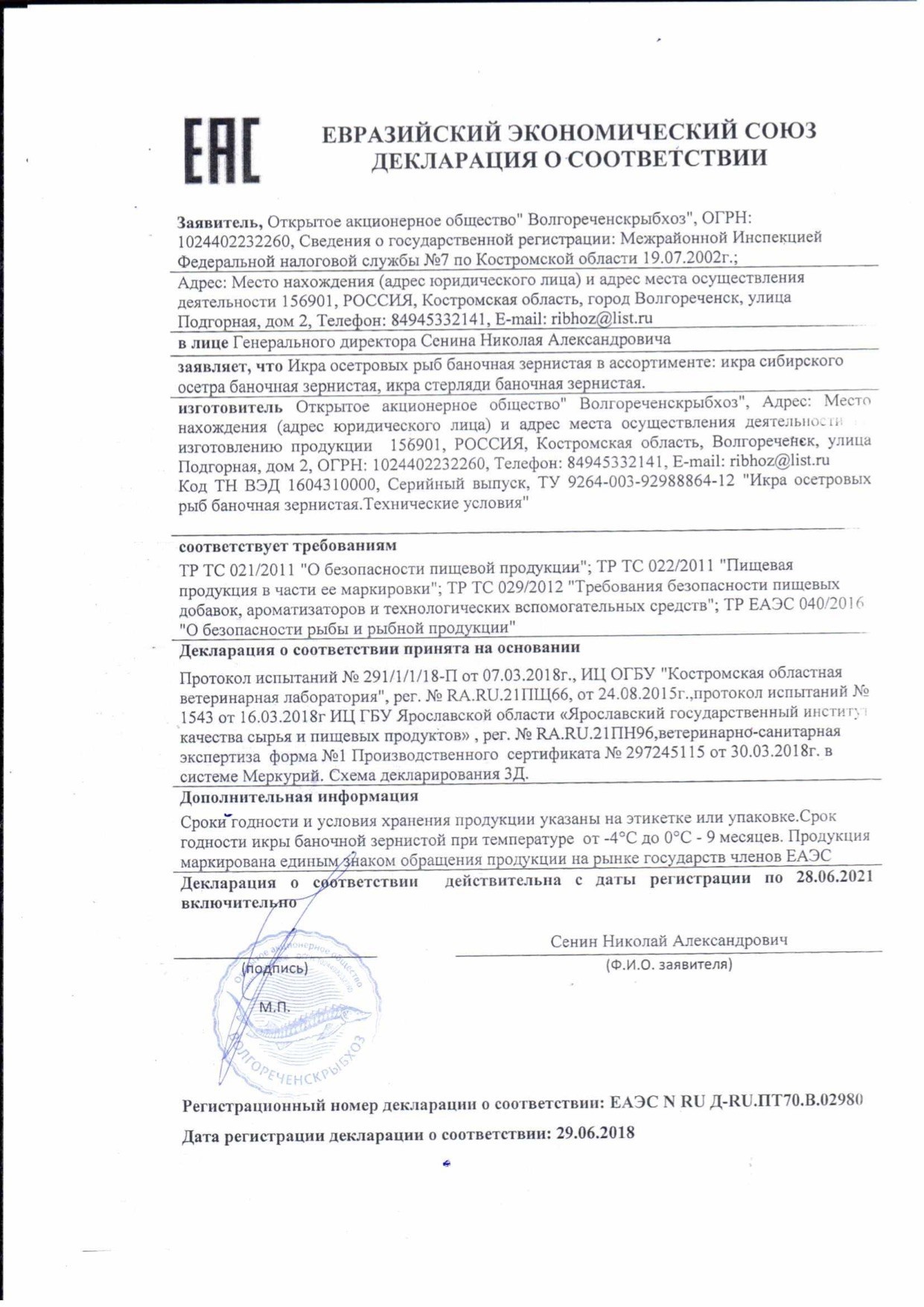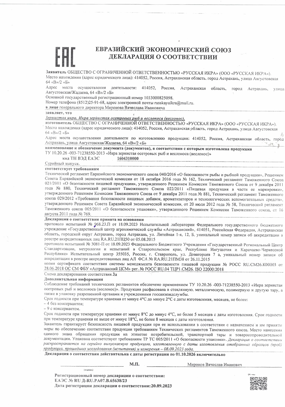 Мы добавляем в икру соль, только в кол-ве 3,7% (малосол) и пищевую добавку Варекс 11. Данная добавка обеспечивает микробиологическую безопасность осетровой икры, сохранность от окисления жира и горечи готовой продукции. Вы получаете свежую, чистую и вкусную икру